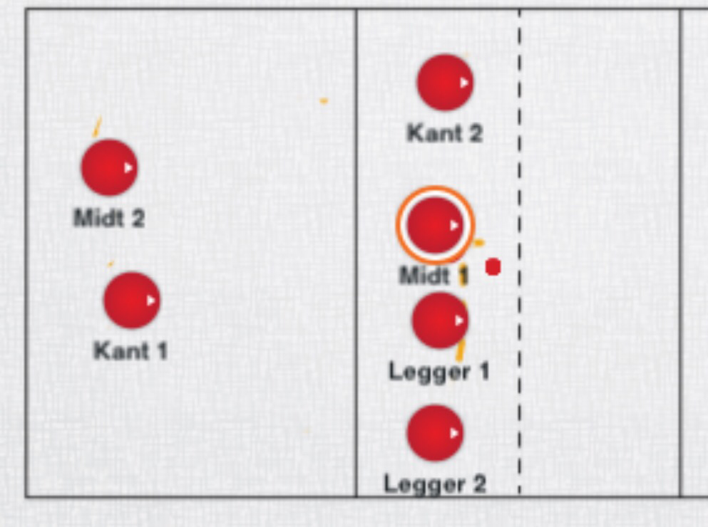Legging ut til pos 4: 3×3 en står i 2 og legger til pos 4 som slår tilbake til pos 1 og løper etter ball. Ball slås fra pos 1 og frem til 2.