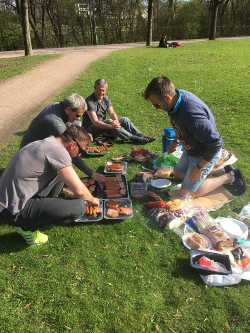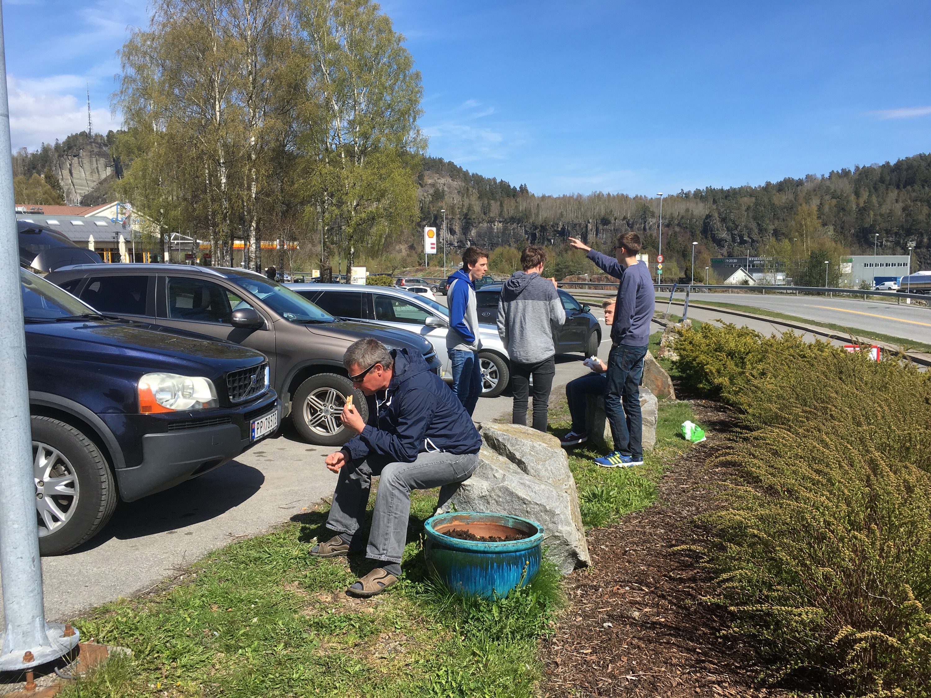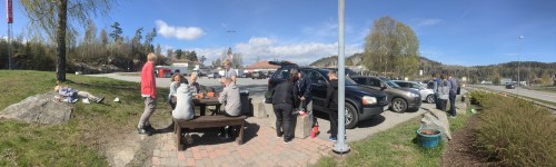 Da var vi avgårde, 31 personer fra Søgne. Først en lunchstopp v Brevik