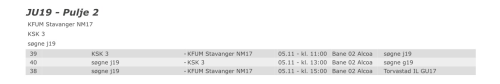 G19 har kamp kl 12 i alcoahallen. ( og deretter rett i dømming) Vi trenger 2 timer til Farsund og 30 min oppvarming så G19 ( min bil) bør starte fra søgne 0930. G15 bilene kan starte 1130? Jentene er jeg usikker på men 1030??