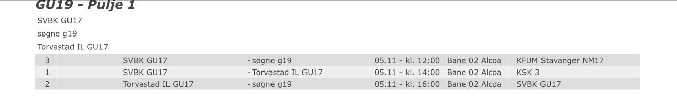 G19 har kamp kl 12 i alcoahallen. ( og deretter rett i dømming) Vi trenger 2 timer til Farsund og 30 min oppvarming så G19 ( min bil) bør starte fra søgne 0930. G15 bilene kan starte 1130? Jentene er jeg usikker på men 1030??