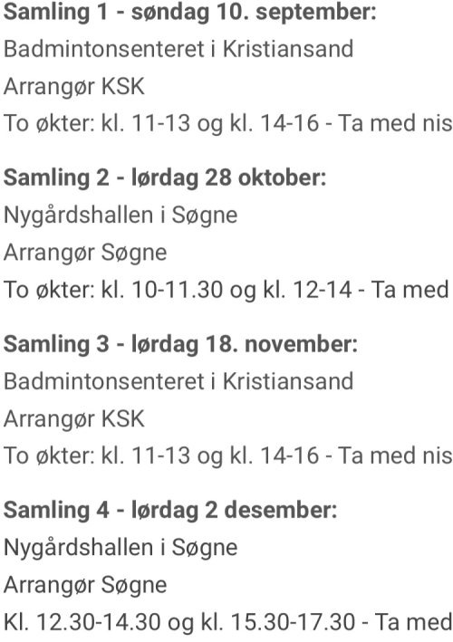 Pakkeliste: Pakk i bag! Ha liten sekk e.l i tillegg til bruk i hall og bil. Hotell ligger vegg i vegg med hall. Ta med 2 kampskjorter .med nummer (er ikke så nøye hva slag snummer) og drikkeflaske,innesko og knebeskyttere. Liten nistepakke til fredagen/bilturen,det blir ikke stopp. Litt kjeks/chips/brus til hotellet, ikke gotteri eller energidrikker.