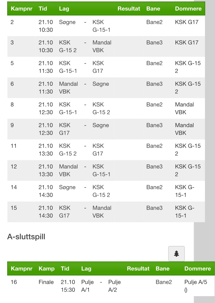 Søn: kamper 11-14 ca. avreise hjem.