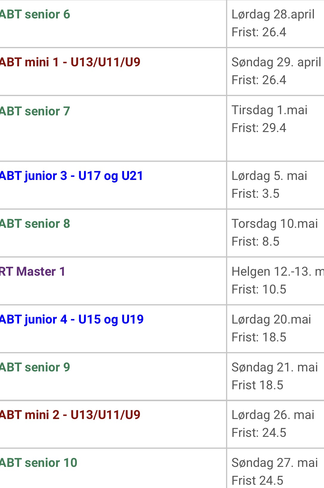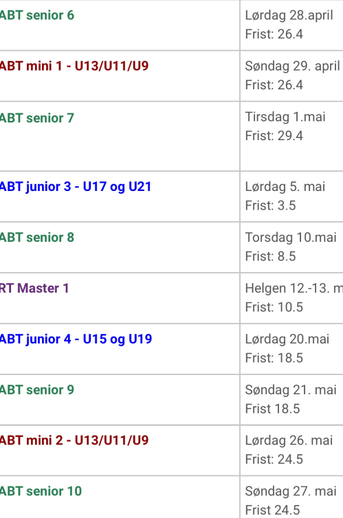 Her er ABT kalenderen. Dere kan melde dere på selv via linkene som dere finner her: